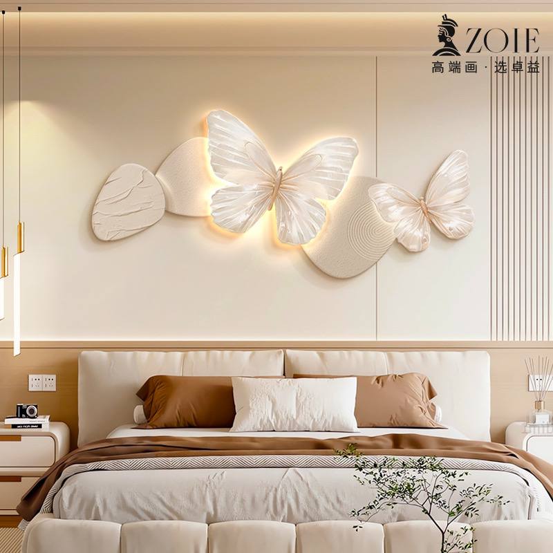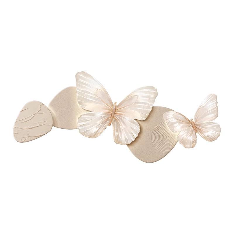 A stunning decorative piece featuring two translucent, glowing butterflies gracefully perched on textured, neutral-toned shapes. This artwork blends natural beauty with modern design, making it perfect for enhancing any living space with a touch of sophistication and warmth.