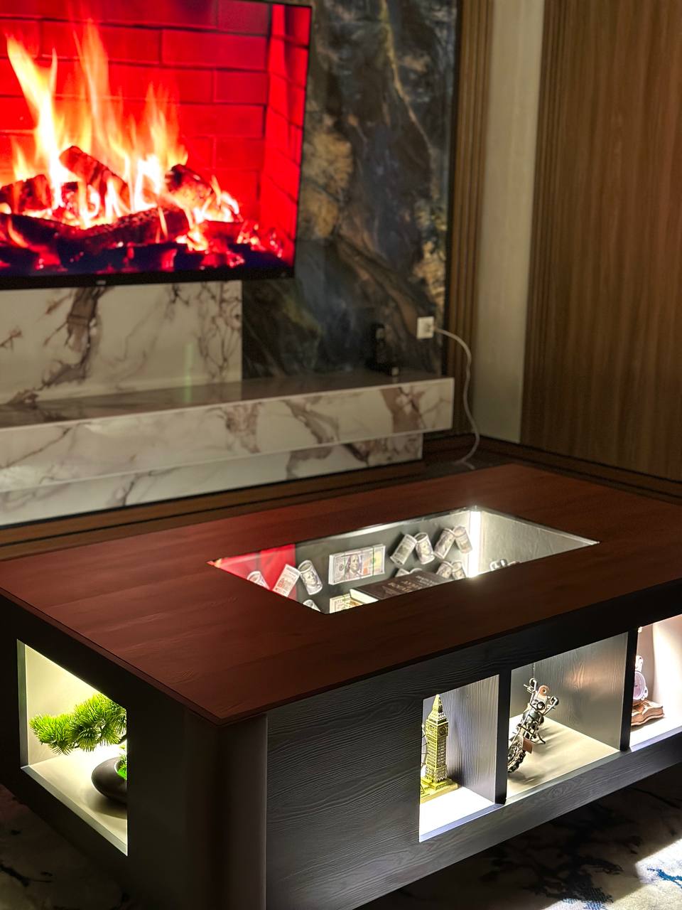Inside the table you can place everything you like! Photos, souvenirs, favorite collectibles, trophies – everything that will make this table unique and personal. We can arrange the interior space according to your order, taking into account any of your wishes. Create your perfect designer table that will be not only stylish, but also special, reflecting your memories and taste!