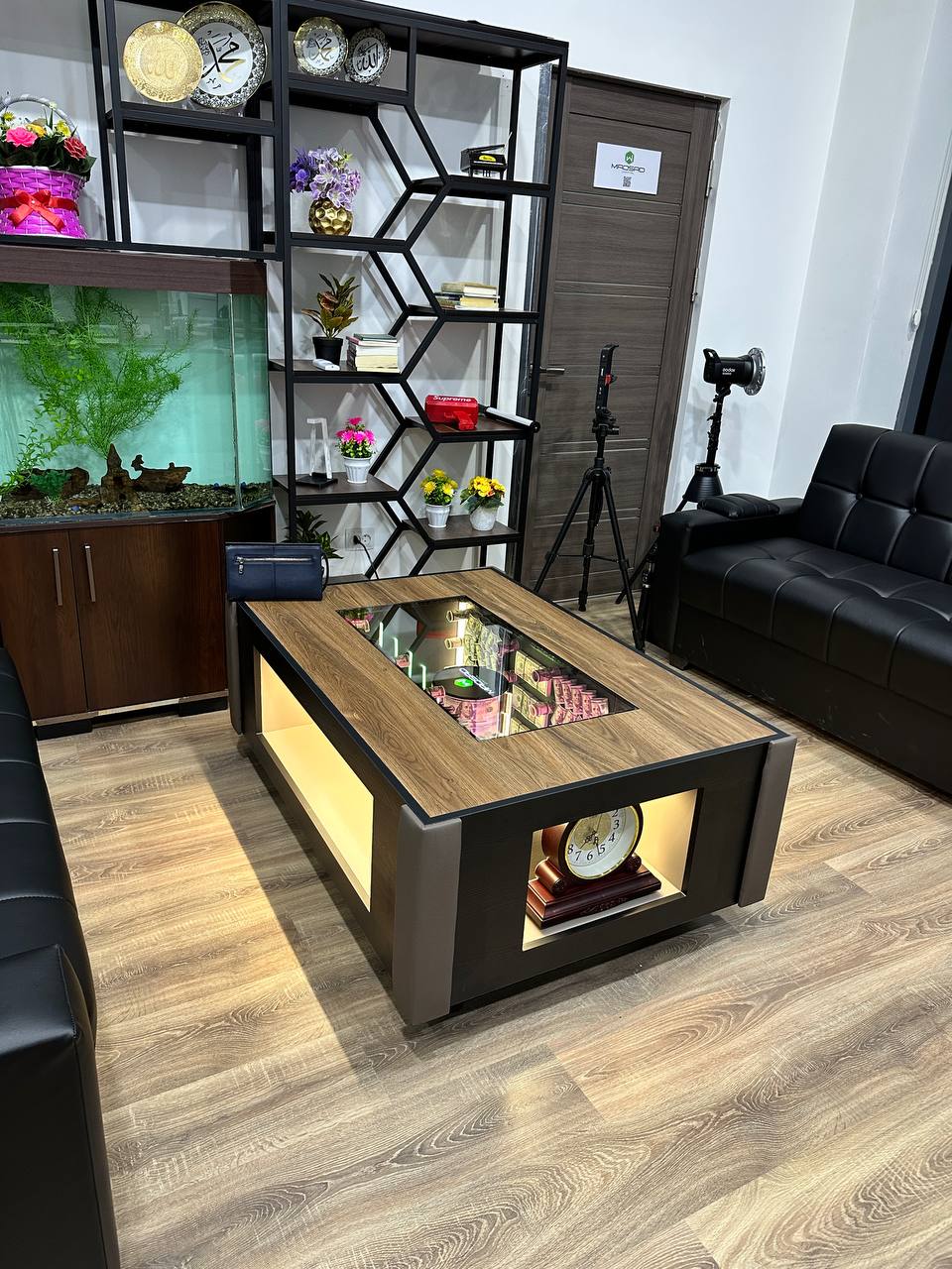 Luxury Modern Coffee Table with LED Display Shelves & Glass Top – Elegant Living Room Centerpiece