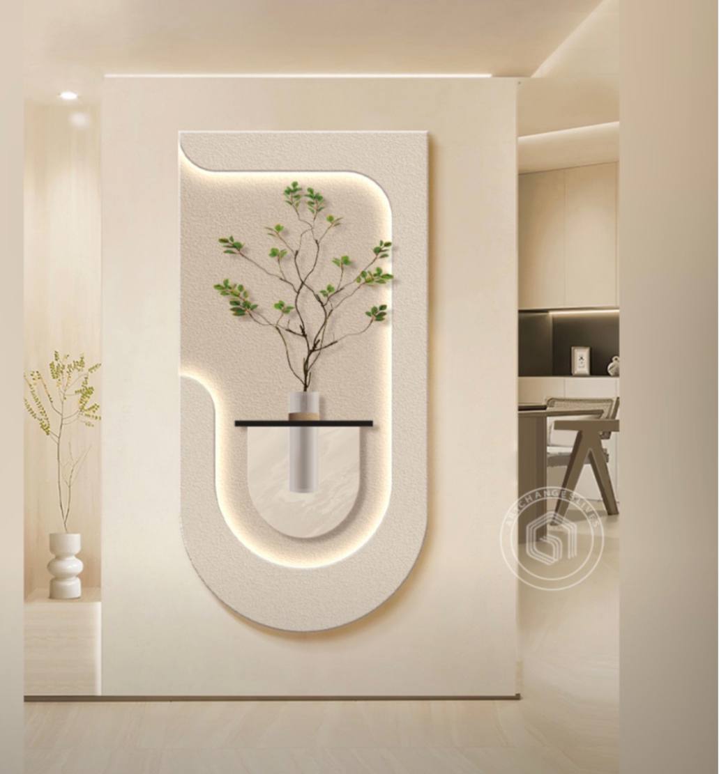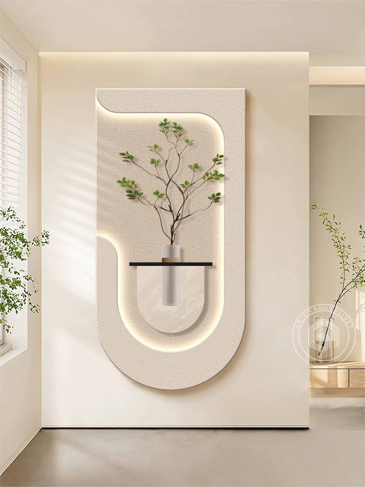 A modern, minimalist wall design featuring a textured, U-shaped panel with soft LED backlighting. At the center, a sleek cylindrical vase holds a delicate branch with green leaves, creating a harmonious blend of nature and contemporary design. This decor piece adds elegance and warmth to any living space.