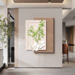 A stylish and elegant wall art piece featuring a layered design with textured beige and brown panels. The centerpiece includes delicate green branches and white flowers, creating a minimalist yet natural aesthetic. This artwork complements modern interior spaces, adding a touch of sophistication and harmony.