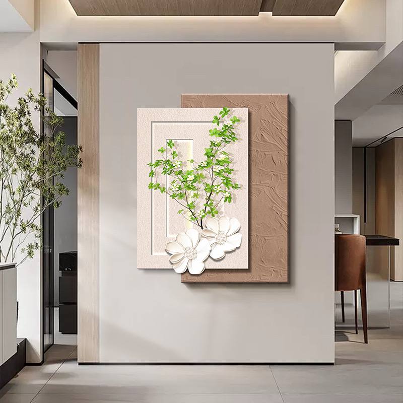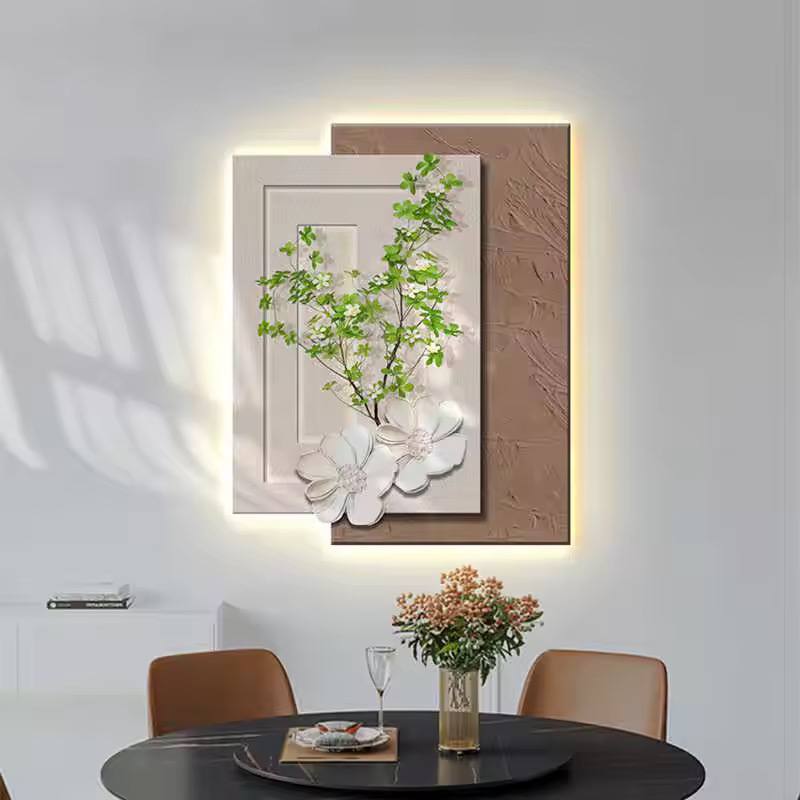 • Design: Features layered rectangular panels with textured surfaces and a realistic floral design, including green foliage and white flower accents, for a modern yet organic aesthetic.